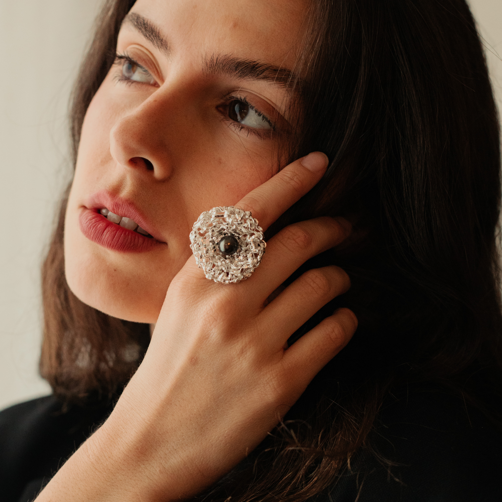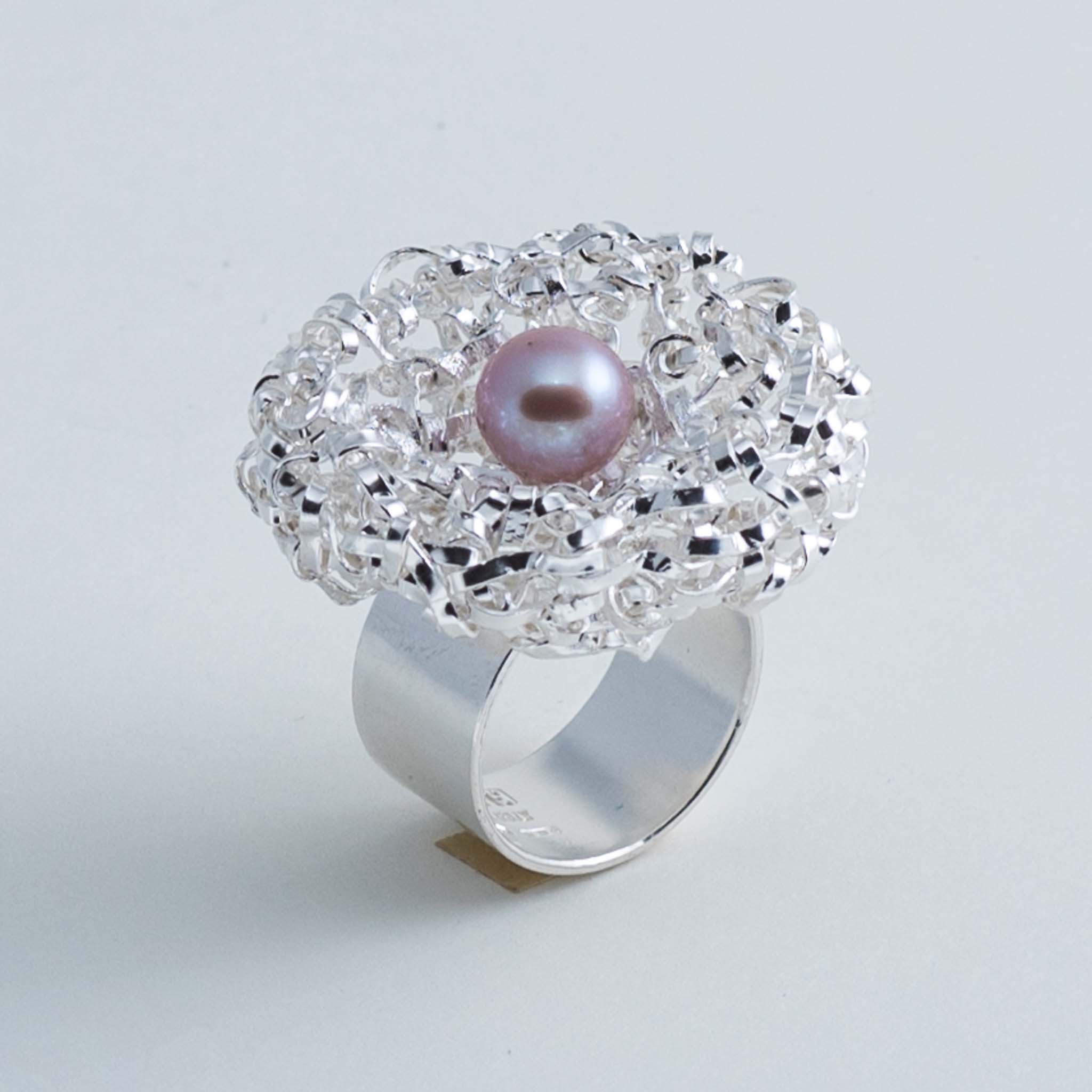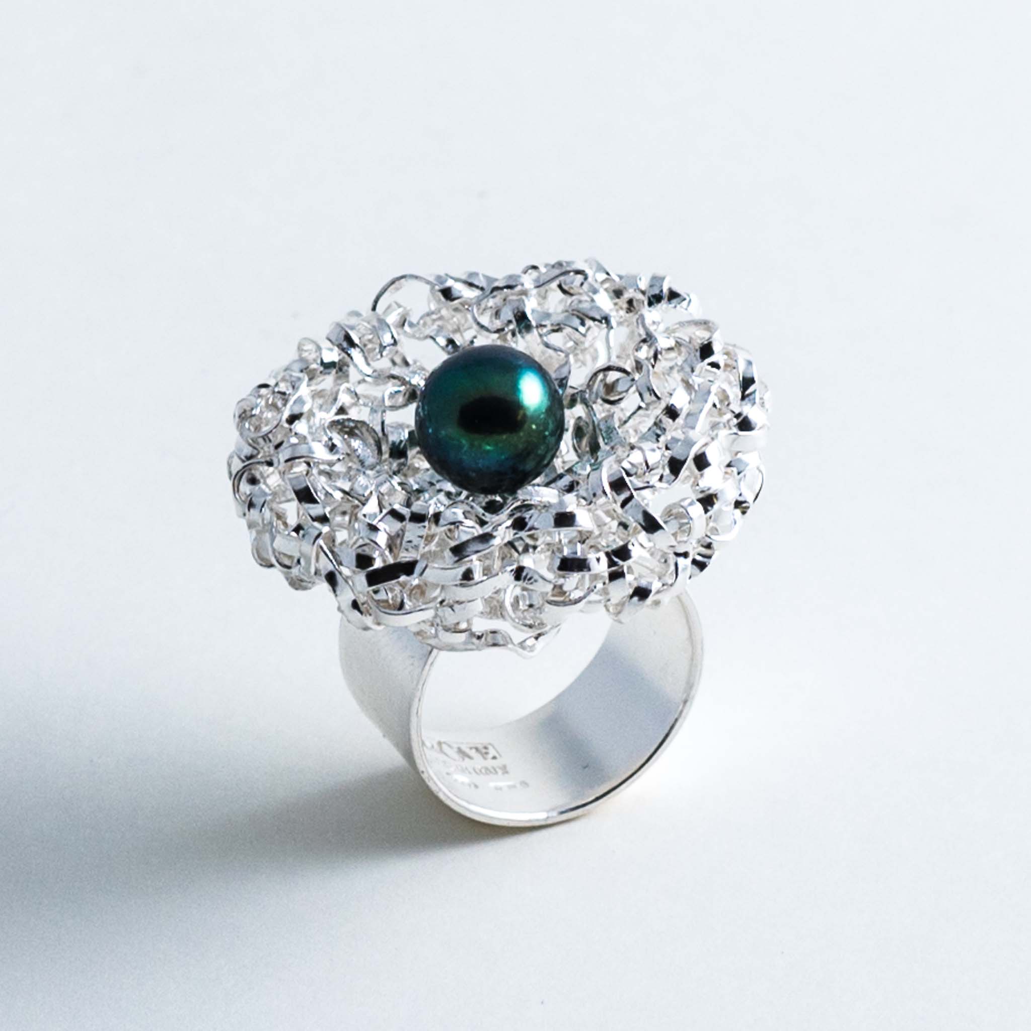La struttura rotonda dell'anello è realizzata con un'esclusiva tecnica di intreccio manuale, partendo da un filo d'argento. Questo rende i gioielli della collezione visivamente accattivanti ma al tempo stesso leggeri e facili da indossare. La lavorazione conferisce loro lucentezza e resistenza.