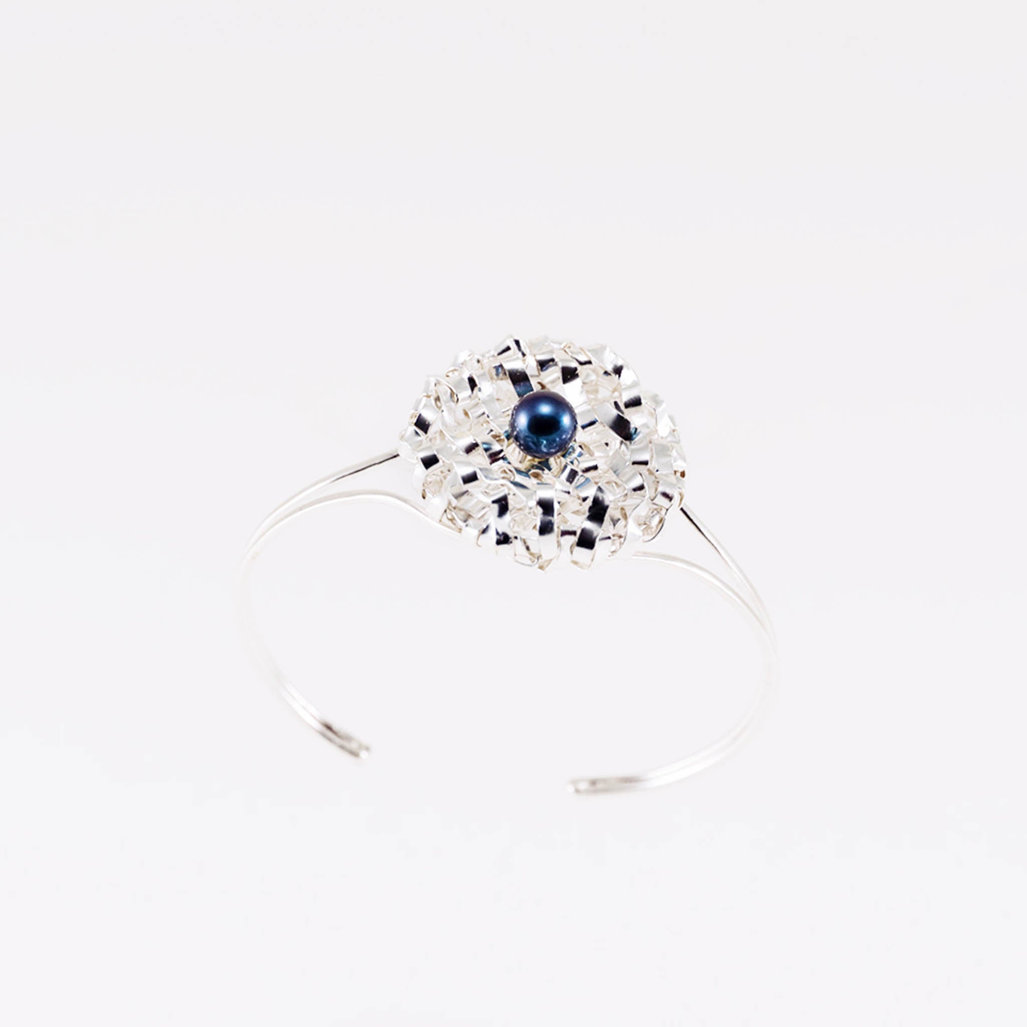 Bracciale schiava con perla d'acqua dolce, realizzato con un'esclusiva tecnica di tessitura manuale, partendo da un unico filo d'argento.