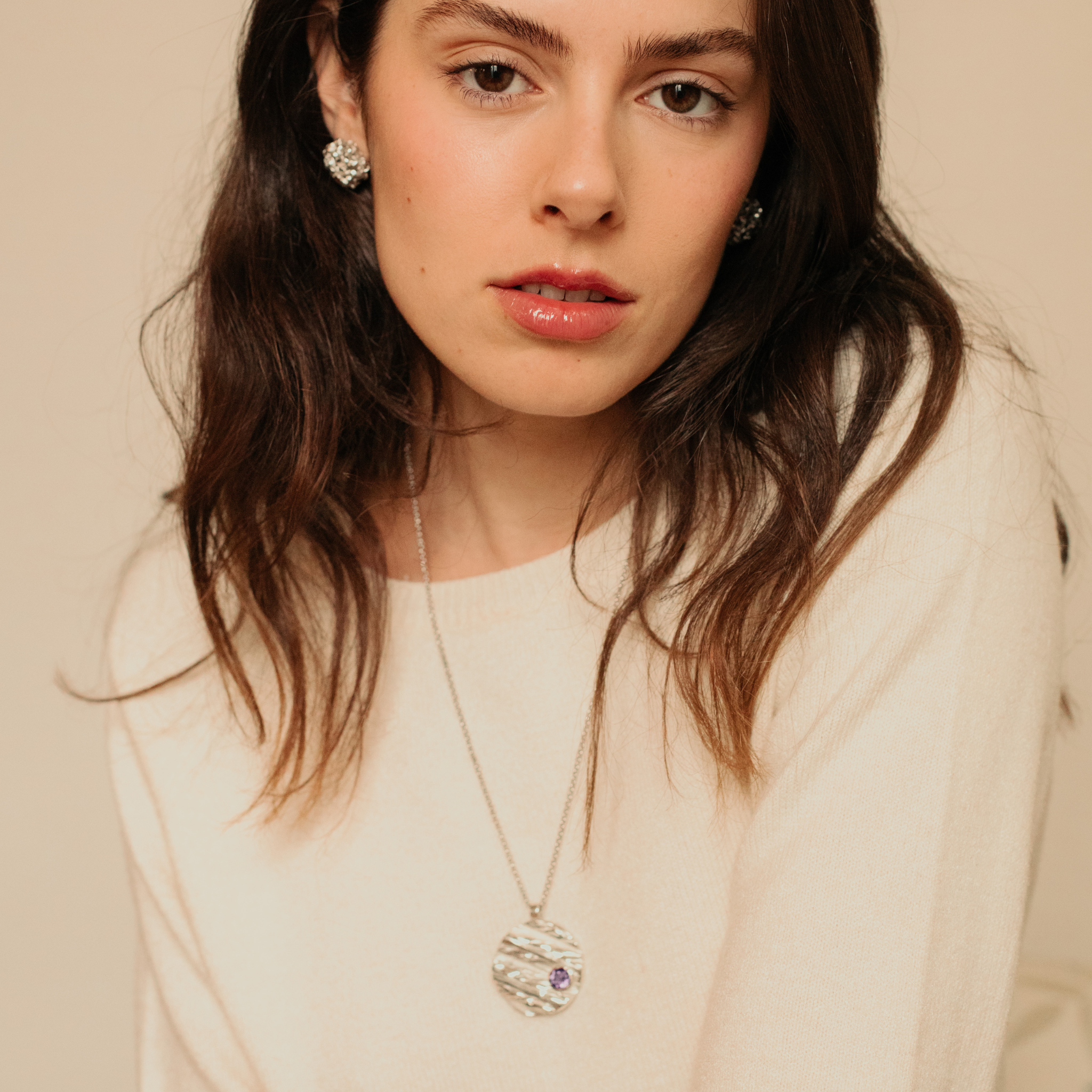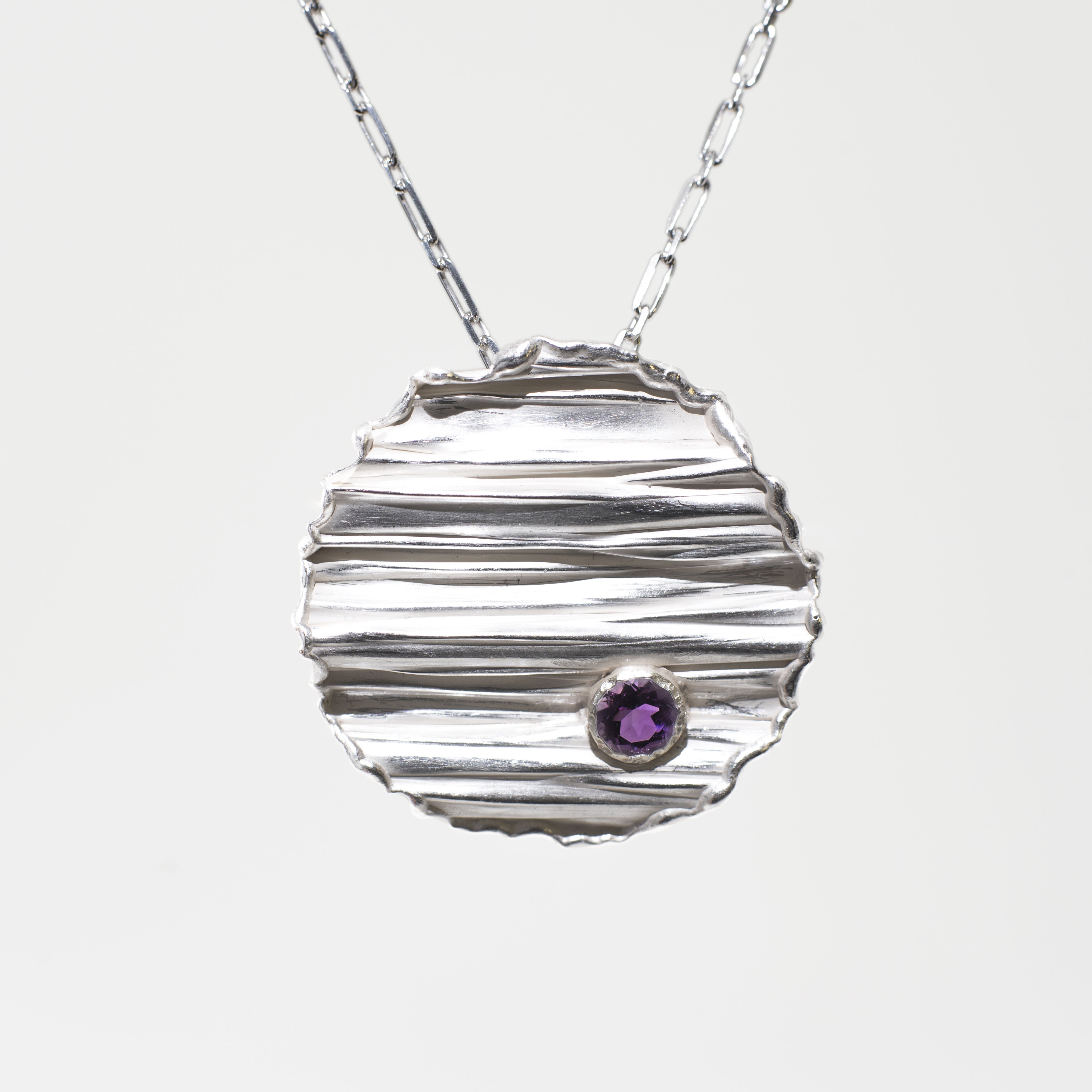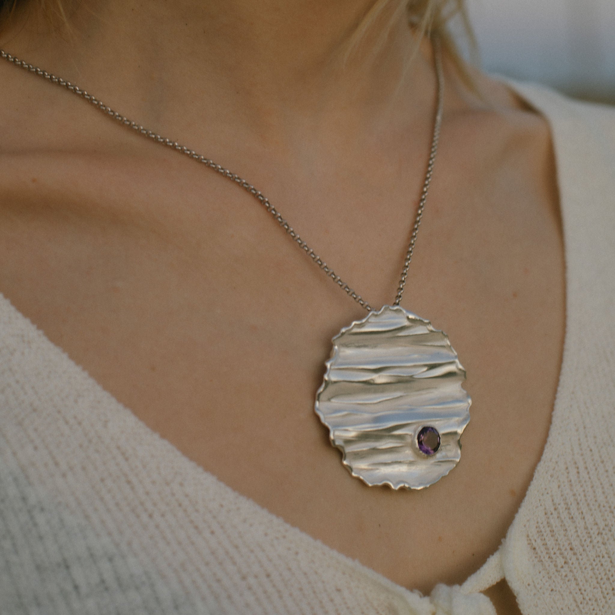 Una particolare texture tridimensionale su lastra d'argento richiama il design, al cui interno è incastonata un'ametista naturale, scelta per la sua eccellente brillantezza e intensità di colore, nota per le sue proprietà calmanti e di favorire la concentrazione.