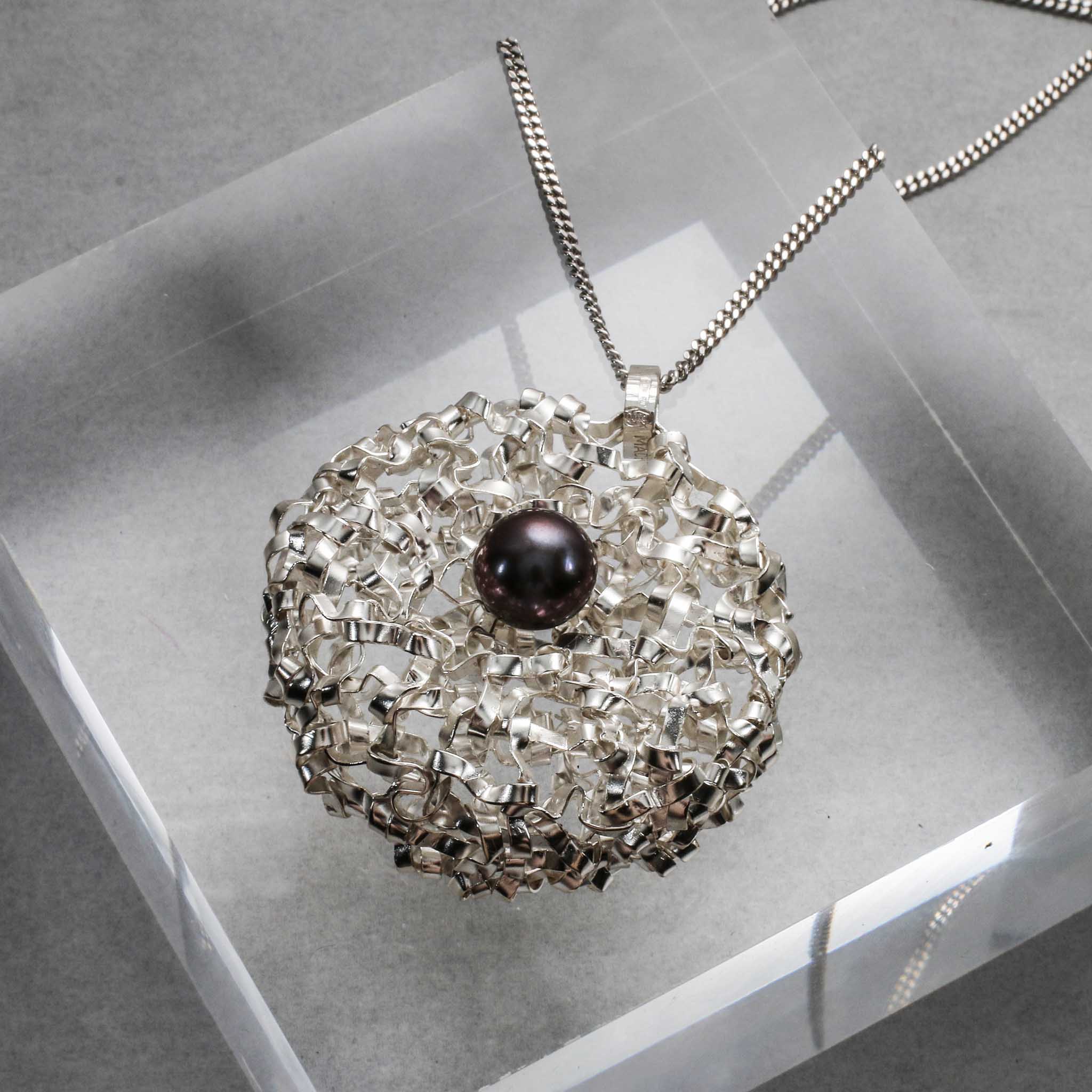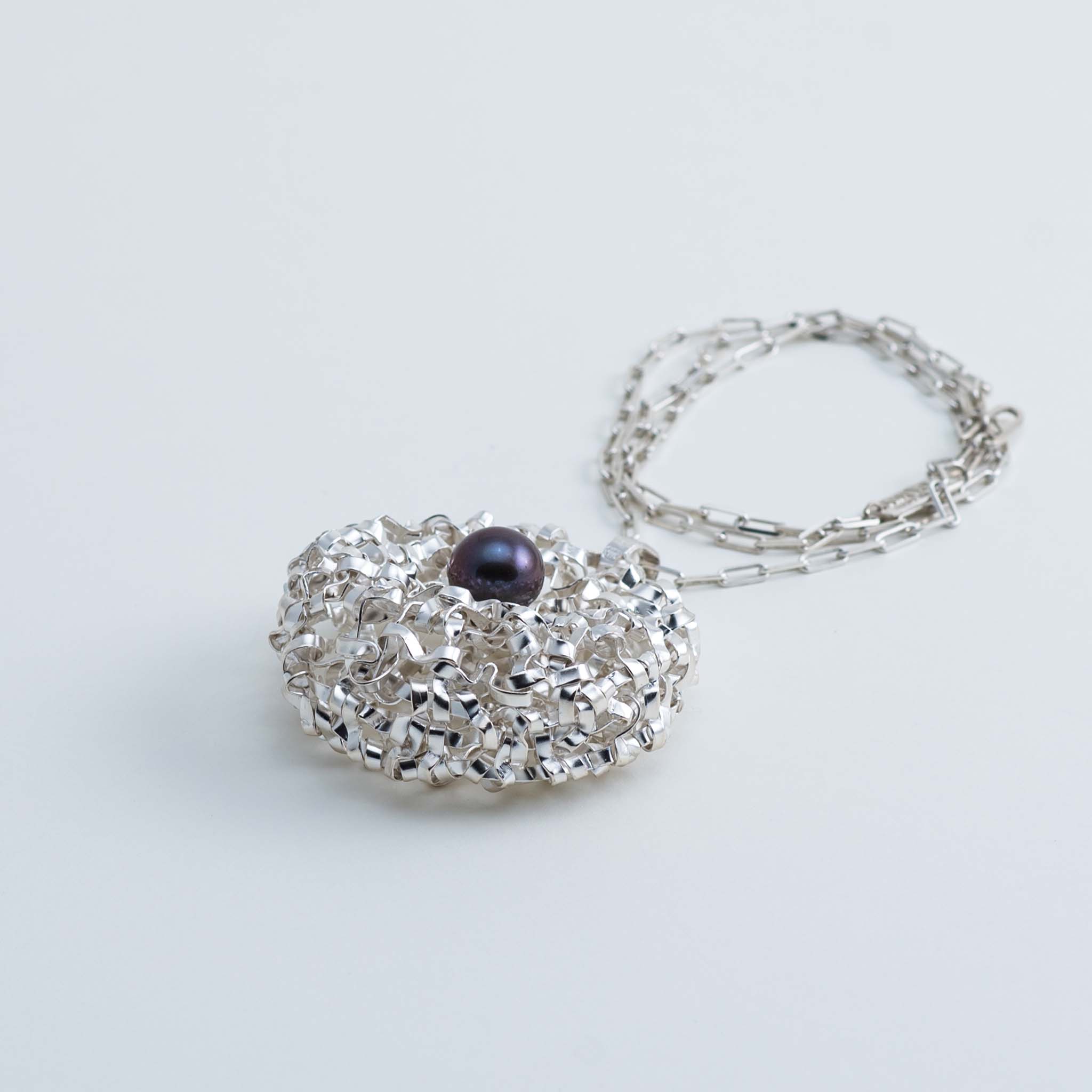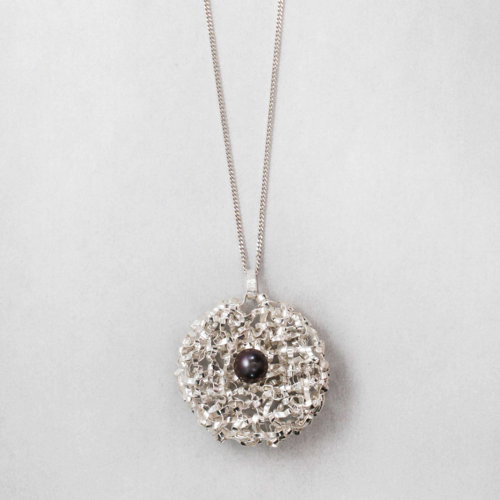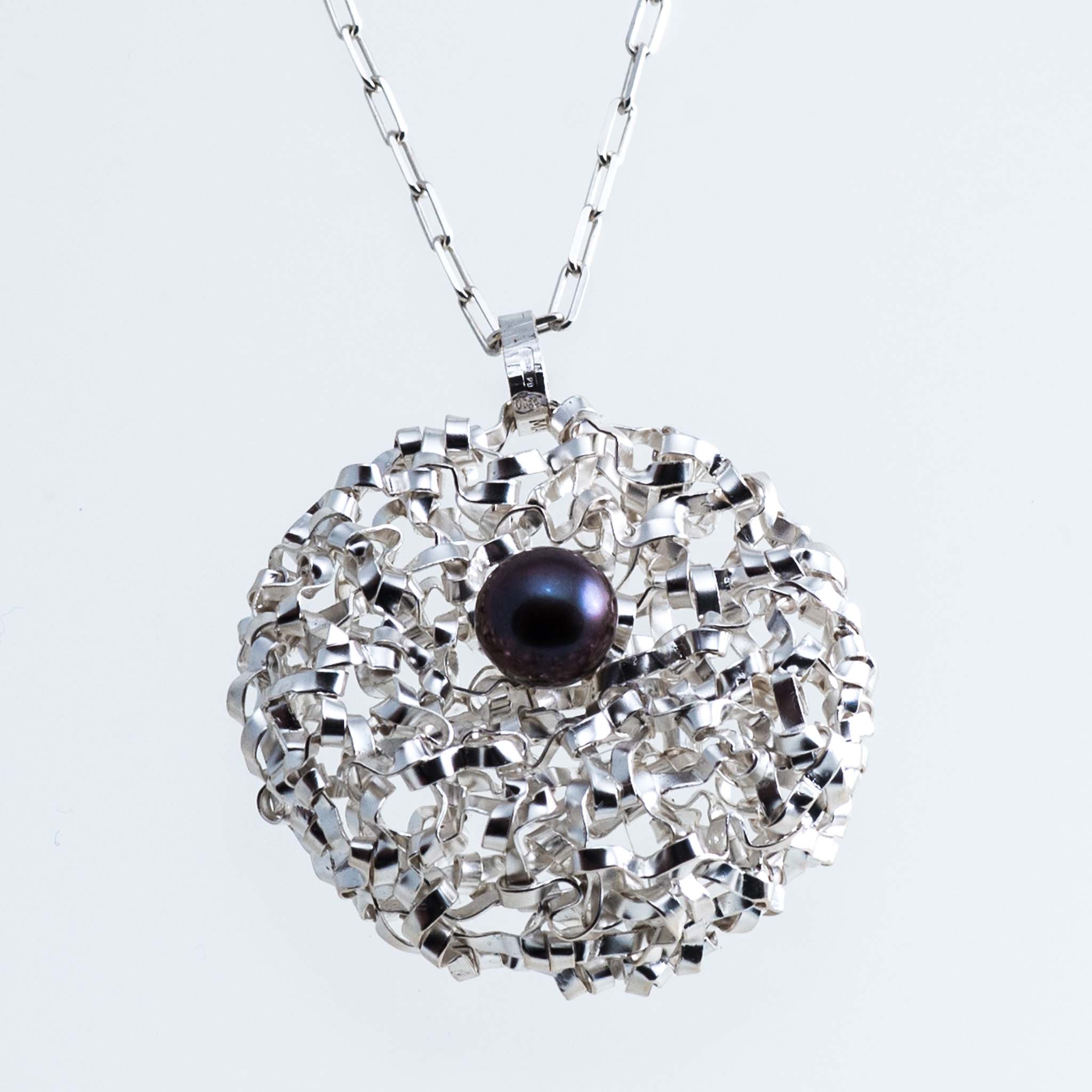 La struttura rotonda del pendente è realizzata con una tecnica unica di tessitura manuale, partendo da un unico filo d'argento, su cui è incastonata una perla d'acqua dolce da 10 mm.