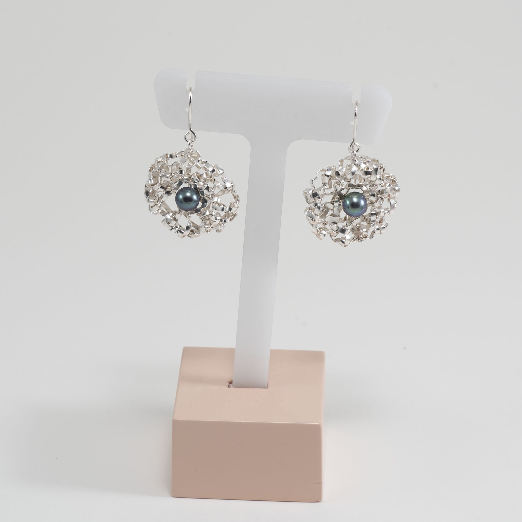 La struttura geometrica rotonda degli orecchini è realizzata con una tecnica unica di tessitura manuale, partendo da un filo d'argento.
