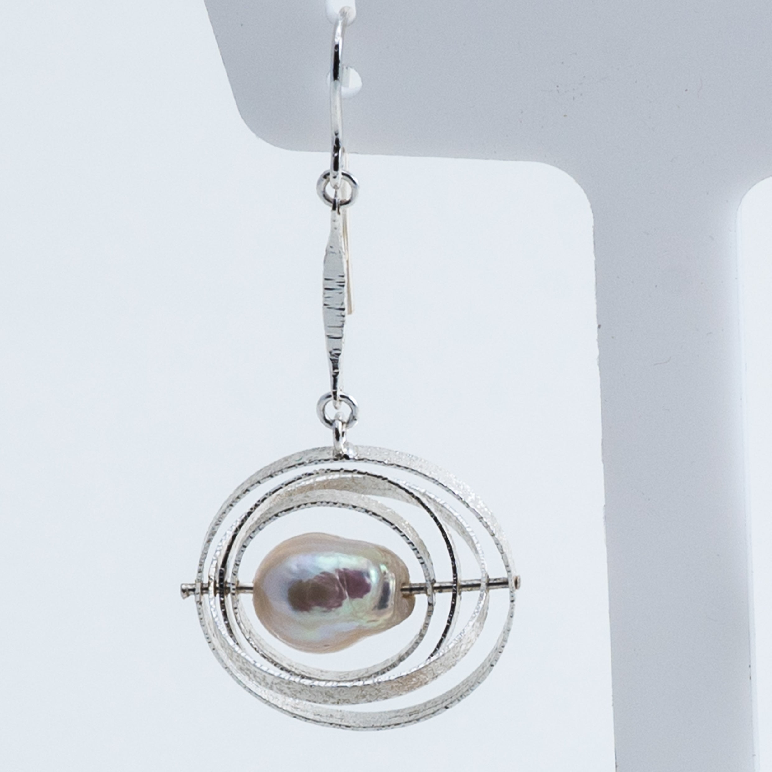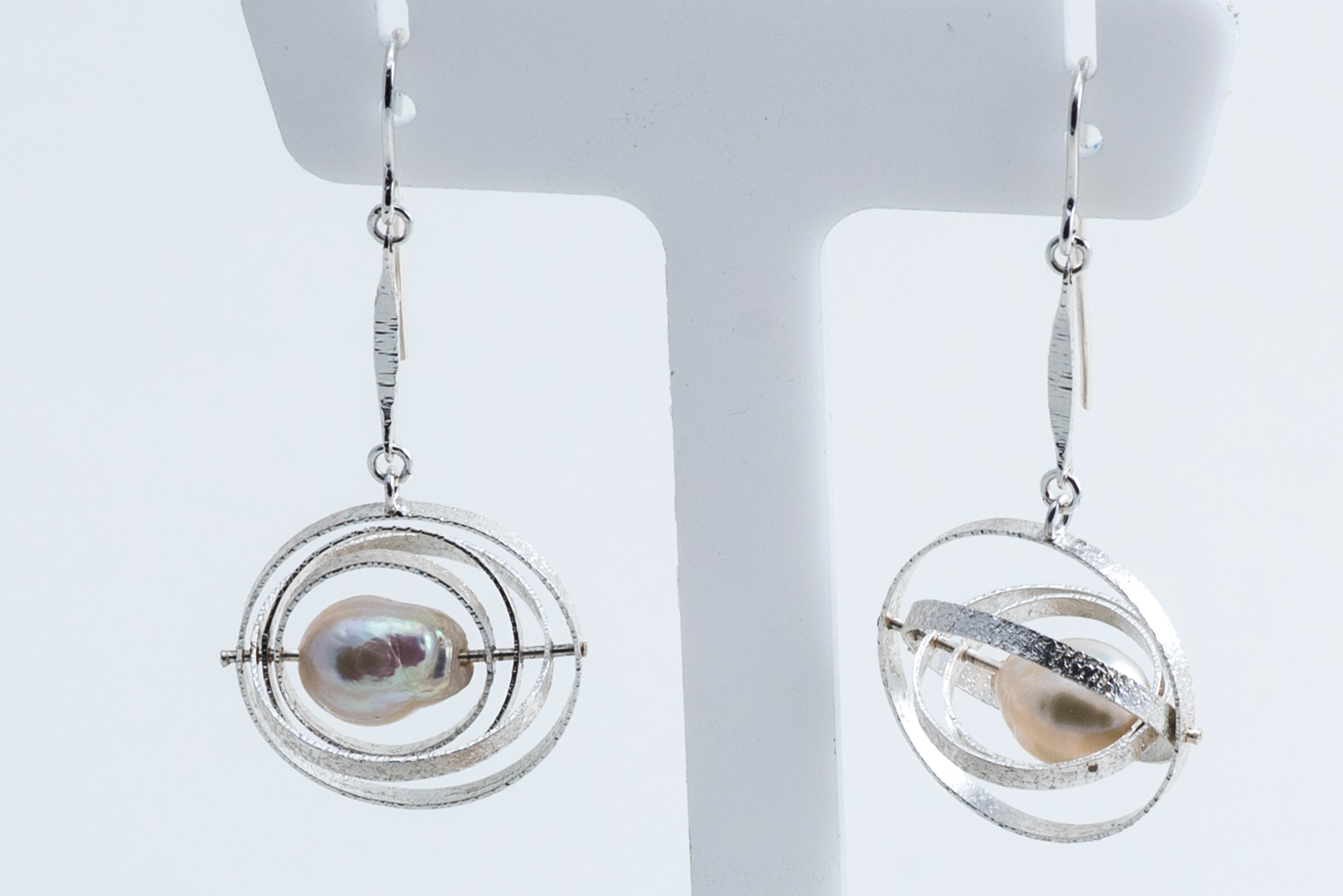 Il dinamismo dei cerchi concentrici trasforma la geometria in qualcosa di unico e sempre diverso. All'interno, una preziosa perla barocca come un pianeta attorno al quale ruotano le sue orbite.
